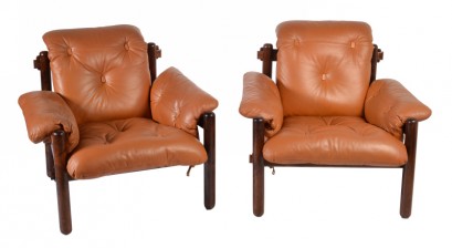 Original tan leather upholstery & jacaranda rosewood frames. -