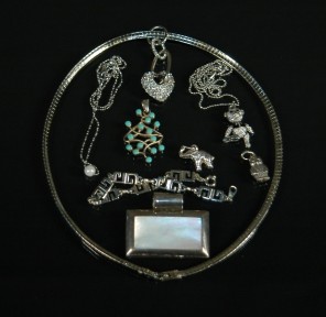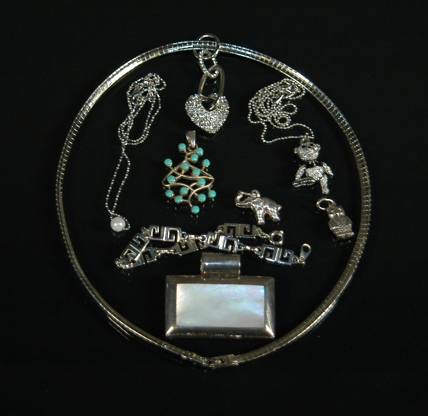 Incl. 2 necklaces, 1 with jointed bear pendant; the other with heart shaped pendant; 1 other chain necklace; bracelet; MOP set pendant; 2 charms & a turquoise set pendant. -