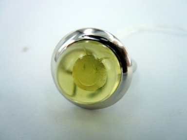 bezel set cabochon quartz with a bee engraved to the back of the stone; 9ct white gold. Estimated weight of lemon quartz 10.35ct. Size M. Weight: 8g. -