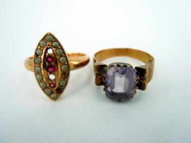one set with an amethyst (size N½) one with paste stones (some missing). Weight 7.7g. -