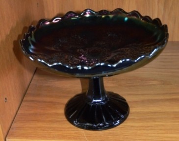 Lot Description:Amethyst carnival glass Tazza footed comport with Waratah & flowers with butterflies
