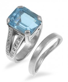 The emerald cut aquamarine with deep blue saturation of 4.38cts, having diamond set split shoulders, together with a fitted wedder, all mounted in 18ct white gold, ring size H. -