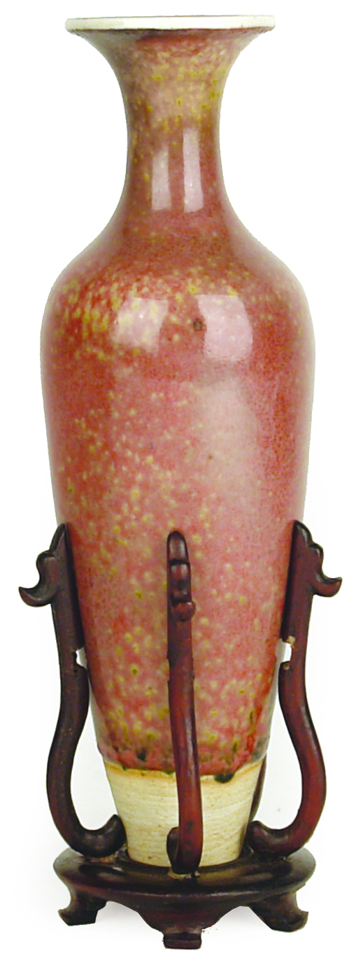 marked inside the deep foot ring with a blue six character Qing Dynasty, Kangxi mark and probably of the period (1664-1722), of slender, high-shouldered form with a tall neck and flaring mouth, tapering to an unglazed foot, the foot ring deeply sunk into the body, the glaze of speckled red suffused with pale yellow-green, at the mouth. From the prescribed group of eight similarly glazed objects to make a set for a Chinese scholar?s table. Raised on specific fitted wooden stand a.f. and cased in a fitted wooden box with glazed lid. Height excluding stand 150. -