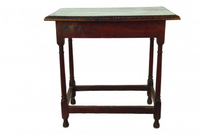 the rectangular plank top with carved repeating detail to the thumb moulded edge, the four restrained turned legs with lower stretchers and ovoid turned legs. 760 x 490 x 735. -