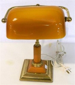 Lot Description:A timber and brass Banker's lamp with amber glass shade