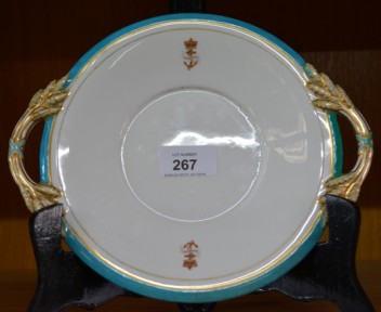 double handled with wheatsheaf motif and bearing twin stamps for Czarina, this ship is famous for sinking in 1907, has had minor glaze repair to one side, 20cm D not including handles -