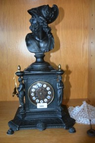 top with a figure of a warrior wearing a helmet, the dial in an ornate design with face mask & enamelled roman numerals, flanked by 2 statues of women in a classical pose, good 8 day movement by Japy Freres, striking hours & half hours on a bell, comes with key and pendulum. Late 19th century, all French made, 47cm H. -