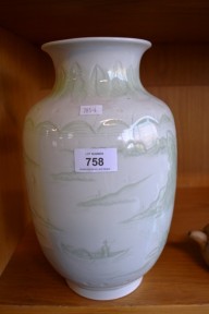 Lot #758 - Unusual glazed vase of a river & mountain landscape scene in pale green