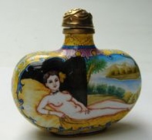 the pouch shaped bottle with a nude painted on the front and reverse, gilt metal cap.