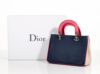 smooth calfskin leather in navy, hot pink and nude, removable shoulder strap, silver tone hardware and 'Dior' charm, leather lining with interior slip compartments, stamped 'Christian Dior, Paris', with COA card, dustbag and box