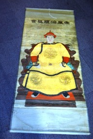 figure & dragon robe, seated on throne chair, with calligraphy, red seal stamp etc -