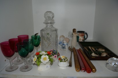 3 posy ornaments to incl. Aynsley, English made character jug by Staffordshire, cased set of 6 silver plate spoons, 6 coloured glasses incl. ruby & green examples, bird figurine - AF -