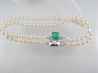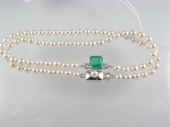 bright claw-set emerald of traditional cut with two brilliant-cut diamonds in white gold on a single row Akoya cultured pearl necklace with 14ct gold and pearl clasp. Estimated weights: Emerald = 1.40cts. Diamonds 2 = 0.14ct. Pearls 4mm. -