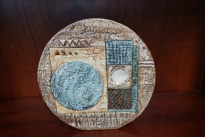 Lot Description:Troika Cornwall England pottery geometric patterned blue and beige large wheel vase