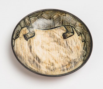 A wheel thrown glazed earthenware dish with sgraffito decoration of a lizard