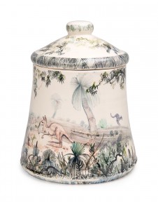 A wheel-thrown, glazed earthenware jar and cover, with painted decoration of kangaroos in the bush, c.1950