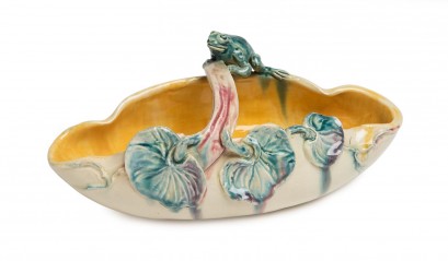 A wheel thrown earthenware basket decorated with a frog and lotus