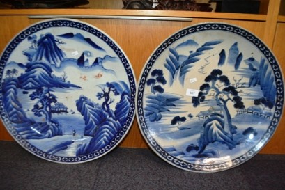 each with a river landscape scene, matching border, each impressed marks to underside, 46cm D -