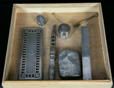 HMSS cigarette case, pierced lid & snuff spoon; EP letter opener; jar & boxes; also, propelling pencil with bloodstone seal. -