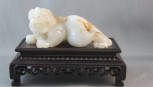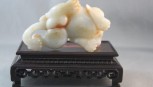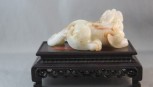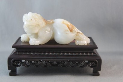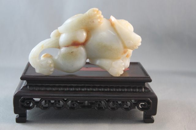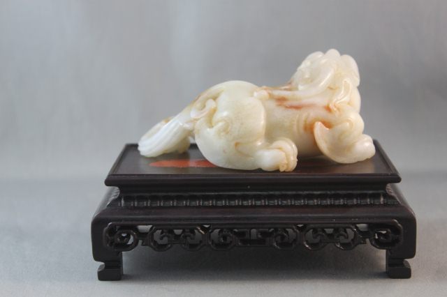 carved standing four square with ruset tones, possibly Qing, on pierced hardwood stand, l 10.5cm -