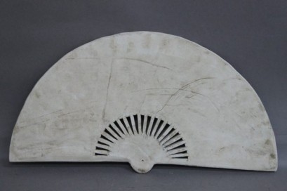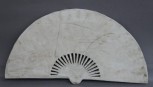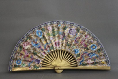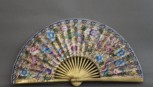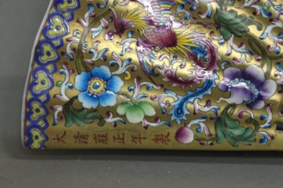 modelled in the form of a fan, lavishly painted in enamel with flower heads and phoenix's in flight on a gilt ground , signed in scrip, l 42cm -