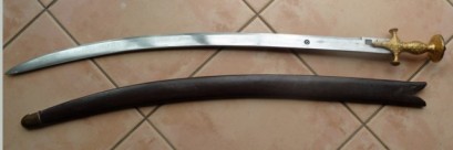 This sword is approx. 90cm long, weighing approx. 1,170 gms. The handle is decorated with gold leaf. Clean & corrosion free blade with clear makers mark. The scabbard is brown leather. -