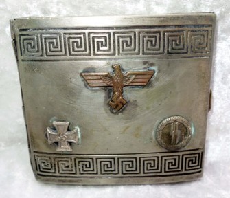 Engraved Border Detail To Both Top And Bottom With 3 Various Third Reich Tinnie Badges Including SS To Front -