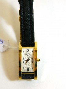 Silver patterned dial, black hands, swiss quartz movement, leather band with gold plate folding clasp. -