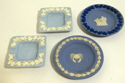 Lot Description:Two Wedgwood jasperware pin dishes and two Vintage Wedgewood Etruria Barlaston Grape Vine Ashtrays