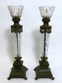 Lot Description:A pair of cut crystal metal mounted torchère glass and metal candle sticks