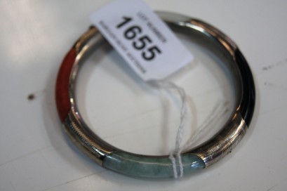 Lot Description:Hinged Chinese white metal bangle with inserts of various hard stones