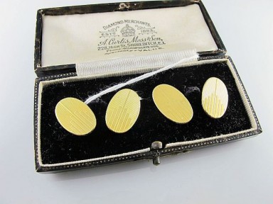 engine turned Art Deco design with chain connections; Birmingham 1934. (cased for Curtis Moss & Son) Total wt 12.2g. -