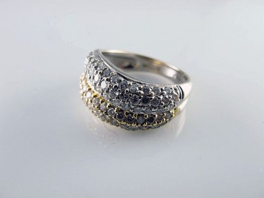 white and yellow gold bands pavé-set with 93 diamonds; 18ct gold. Estimated weight of diamonds 93 = 1.40ct. Wt 6.2g. -