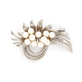 A 1950s sterling silver spray brooch with eleven cultured pearls. -