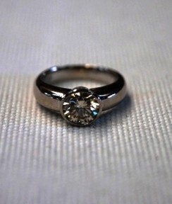 18ct white gold ring, white gold bezel round brilliant cut diamond ring, ring size G1/4, ring weight approx. 5.76grams, diamond grading; colour N, clarity P2, 1.04ct, RRP $5000 -