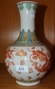decorated with 2 iron red dragons, contesting a flaming pearl, 6 character marks to base, 29cm H -