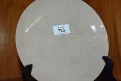 Lot #735 - Cream glazed dish decorated with cranes
