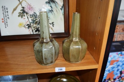 Lot #798 - Pair of Chinese celadon glaze vases with fluted lobed octagonal bodies & tall tapering necks