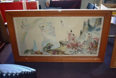 Lot Description:Large framed Chinese embroidered picture of flying maidens among rocky landscape