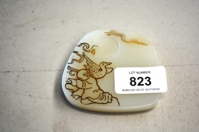 Lot #823 - White jade style stone ink stone with engraved detail of bird & child with clouds