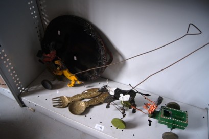 lion chasing a man and a cow pulling a cart, ebonised timber circular serving tray, pair brass salad servers -