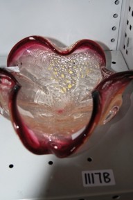 Lot Description:Studio Glass bowl with ruby coloured flaired rim and gold flake design