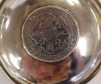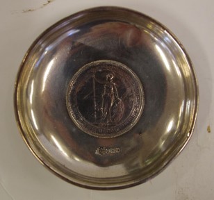with Great Britain 1 Trade Dollar 1897 centered, hallmarked Sheffield 1923, weighs 60 grams approx -