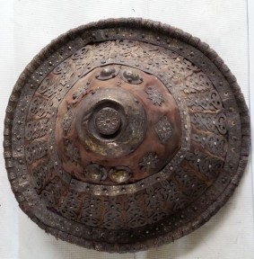 deep conical form with hide handle, the outer surface with copper and brass inlay and fabric filigree, Mongolian?