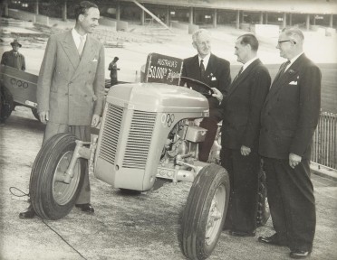 with sign 'Australia's 50,000th Ferguson, the tractor & trailer with Olympic rings on side shown at the MCG with W.S.Kent-Hughes (Chairman of Olympic Organizing Committee) at the wheel, framed & glazed, 26x20cm. -