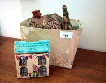 Lot #428 - A money box, together with model homes and vegetation for clockwork railway