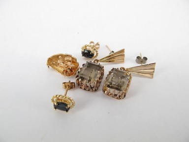 14ct gold and smoky quartz drops (metal butterflies), a pair of 14ct gold and diamond earrings and a pair of 9ct gold and black sapphire ear-studs. (3) -