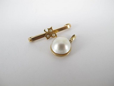 a Mabe pearl pendant and a half-pearl trefoil bar brooch. (2) Total wt 3.4g. -