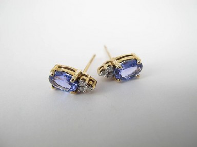 each an oval tanzanite with three diamonds; 9ct gold. -