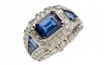 in Art Deco style, centre emerald cut sapphire 2.57ct, 0 channel set blue sapphire, 34 bead set diamonds, 4 brilliant cut diamonds and 18 rub over set diamonds, total weight approx 10.1 grams, size M-N/6, valuation available. -